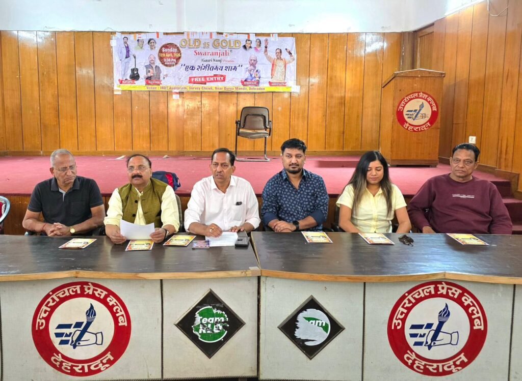 देहरादून,। दून के संगीत प्रेमी 12 अप्रैल को दोपहर 3 बजे से सर्वे चौक स्थित आईआरडीटी ऑडिटोरियम में आयोजित ‘ओल्ड इज़ गोल्ड नाइट’ बाय स्वरांजली का आनंद ले सकेंगे। इस कार्यक्रम की घोषणा आज देहरादून प्रेस क्लब में आयोजित एक प्रेस वार्ता के दौरान की गई।